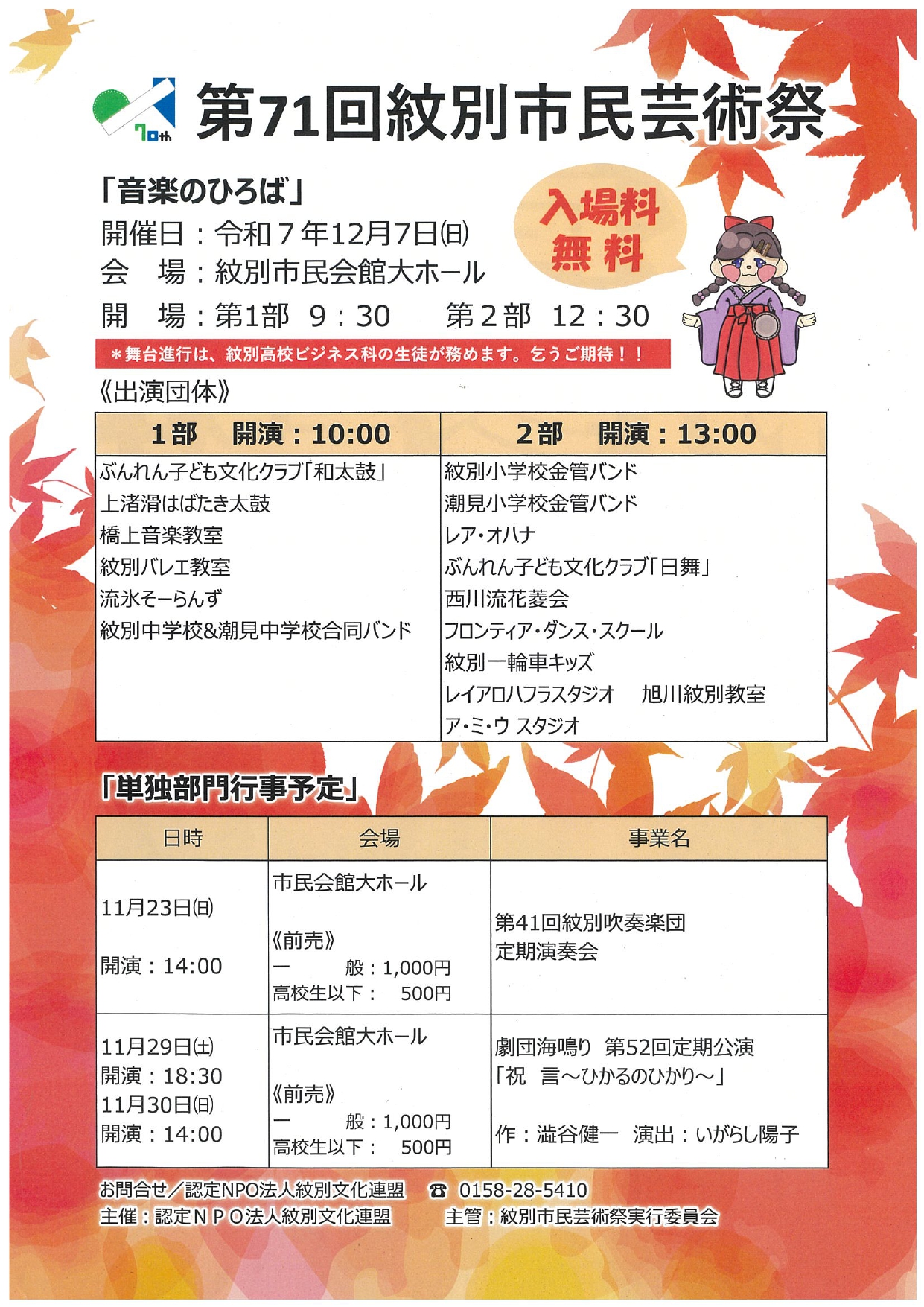 第71回紋別市民芸術祭「音楽のひろば」開催のお知らせ